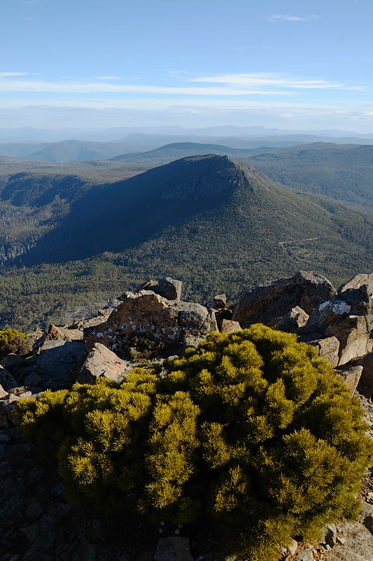 With good weather forecast, at least for most places, a good mountain walk was in order. I chose Mount Field West, a walk I have always enjoyed, if always found to require a good deal of effort. The walk is 16km and requires about 750m of climbing, including the climb back over the Rodway Range on the return. A significant portion of the walk is on boulders which require care and extra effort, and once you are beyond the Tarn Shelf turnoff, the track is mostly quite rough, even where it's not on boulders. The summit plateau at Mount Field West is lovely though, and views to the west and southwest can be terrific, Florentine Valley forestry operations notwithstanding. On this day I got pretty good views for much of the day, but the cloud came in while I was at the actual peak, so no westward views this time.